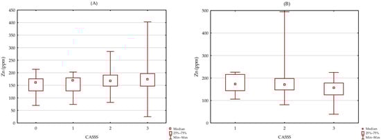 A lack of significant association between Zn level and CASSS in groups of patients without (H = 2.076 p = 0.557; Figure 1A) and with a history of MI (H = 0.000 p = 1.000; Figure 1B) was observed.