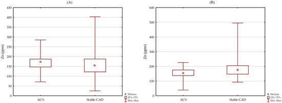 Despite great efforts to advance prophylaxis and treatment, cardiovascular diseases (CVDs) are still the leading cause of death in the world. In 2019, CVDs were responsible for 17.9 million deaths worldwide, which is 85% of deaths from myocardial infarctions or strokes. These numbers are growing, as experts predict that in 2030 CVDs-related deaths could rise to 24 million annually []. Despite Zinc (Zn) being one of the key microelements of the human body [], its role in CVDs pathogenesis has not yet been firmly established. The available data generally show unfavourable levels of this metal in cardiology patients as low concentrations were found particularly in patients with CAD [], heart failure [,,] and atrial fibrillation []. Moreover, patients with left ventricular hypertrophy and atrial fibrillation had an inverse correlation of Zn concentration with heart muscle thickness []. However, data on the relationship between Zn concentration and coronary artery disease (CAD) are limited [,,,,,] and are mainly based on serum Zn concentration. Analytical methods commonly used to assess Zn levels in blood and urine do not show the full picture of microelement supply, as Zn content in serum is easily influenced by the time of the day, the type of meal eaten before obtaining the sample, the serum protein concentration, as well as the natural homeostasis mechanisms controlling the Zn concentration utilizing tissue storage []. Hair sample analysis has several advantages over serum samples. The concentration of Zn in a hair sample is about 100 times higher than in serum, and it is not as labile as serum concentration, which makes it perfect for long-term nutrition assessment []. In addition, the hair sample better reflects the recent excessive exposure to metals, as cations are quickly transferred from blood to tissue storage [,]. Hair samples are considered a good retrospective marker of microelement nutrition in the previous 6–8 weeks. As the concentration of Zn in hair is reported to reflect its content in other tissues [,,], we decided to explore this approach.