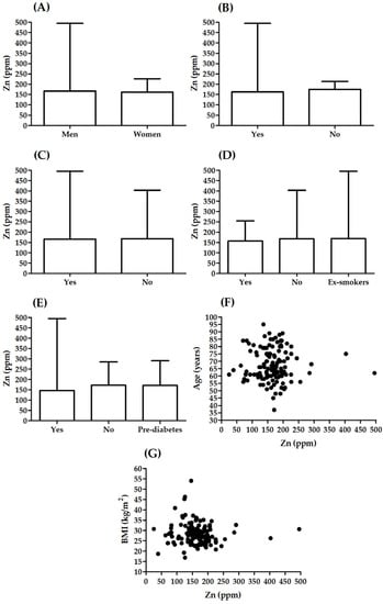 Association between Zn level and selected parameters: (A) sex, (B) hypertension, (C) hyperlipidaemia, (D) smoking status, (E) t2DM, (F) age, (G) BMI.