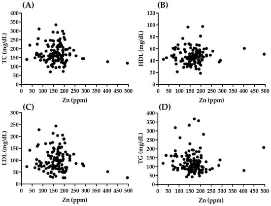 Correlation between Zn level and lipid profile: (A) TC, (B) HDL, (C) LDL, (D) TG.