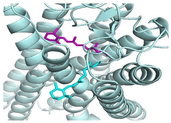 The docked retinal at the putative secondary retinal-binding site (cyan) proposed in [] and the crystal complex of the retinal (purple) is bound with rhodopsin, PDB ID: 2X72, [].