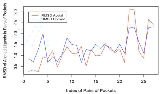 Figure 4 shows a plot of the RMSDActual and RMSDDocked of the aligned ligands of the pairs of pockets as found in complex with the proteins deposited on PDB and when docked into the same binding site (see Section 2.7). We observe from Figure 4 that the two plots exhibit a similar pattern for the control dataset. Additionally, a paired sampled t-test on the RMSDActual and RMSDDocked revealed no significant difference in the mean RMSDActual (1.2414 ± 0.7654) and RMSDDocked (1.3900 ± 0.5060) (t = −1.5849, df = 26, p-value = 0.1251) for the control dataset. These results are good indications for the reliability of the docking results.
