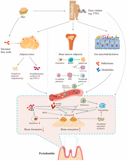 The association between obesity and periodontitis in different ethnic and age groups is reasonably well demonstrated in the aforementioned studies. However, the causal—effect relationship and the direction of this causality have not been clarified, and potential biological/pathological mechanisms have not been evaluated or determined. Based on the current evidence, it can be speculated that the connection between both diseases is of a casual nature, and that this relationship would be bidirectional. Further laboratory-based and longitudinal population/cohort studies are warranted to establish this bidirectional causal relationship. Several potential pathophysiological mechanisms exploring the interactions between the current appreciations of how adiposity negatively affects the homeostasis of marrow, bone, gastrointestinal system, and beyond—thereby influencing periodontal health—will be discussed in the following sections.