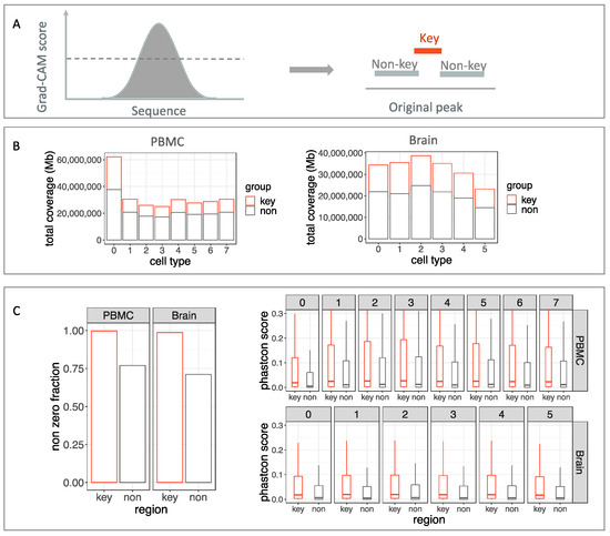 To confirm that important regions were accurately selected by the object detection module, we compared the cross-species conservation scores of the excluded non-key regions vs. the selected key regions. Regions that serve important regulatory functions should be conserved, as any mutation would increase the likelihood of disadvantaged phenotypes [33]. Therefore, a higher conservation usually indicated important regions. We downloaded the 100-way PhastCons scores [35] and calculated the mean PhastCons score of each excluded non-key region and key region. We found all peaks for the PBMC PhastCons scores to be bigger than zero, while about 25% of the excluded non-ley regions have PhastCons scores of 0. We also compared the PhastCons scores’ distribution between the key and non-key regions for each cell type. We found all key regions have higher PhastCons scores than the non-key regions (p-value < 2.2 × 10−16, one-sided t-test) (Figure 4C. This demonstrated that the object detection module of scEpiLock refines the scATAC-seq peaks to the conserved and functional regions for each cell type.