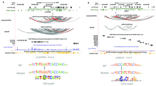 The scEpilock-identified important variants fell into two categories: (1) SNPs linked to established disease-related genes where the specific causative SNP is unknown; (2) SNPs linked to genes previously not implicated in disease etiology. We examined the top SNPs’ genomic locations, co-accessibility, 3D interactions with nearby genes, conservation scores, overlaps with ENCODE candidate cis-regulatory elements (cCREs), and motif patterns to reveal the mechanism. SNP rs12379999 had the highest delta score of 0.31. It is located around 37 kb upstream from the transcription starting site of PICALM, which is a well-known gene responsible for late-onset AD incidence [39]. In addition, it showed 3D interactions with both PICALM and EED, which is a polycomb-group family member maintaining a repressive transcriptional state. Lastly, it is located within one of the ENCODE cCREs regions and disturbs a putative FOS factor binding motif (Figure 6A). SNP rs12379999 has also been identified as a functional SNP by other methods [26] and is an example of how scEpiLock reveals the functional SNPs for both known and new disease-related genes. SNP rs636317 had the second highest delta score of 0.306. It is located upstream from several MS6A genes, which were previously reported as associating with AD by participating in the regulation of calcium signaling [40]. It had a co-accessibility with the MS6A gene clusters, and potentially impacted gene expression by disturbing the CTCF motif (Figure 6B).