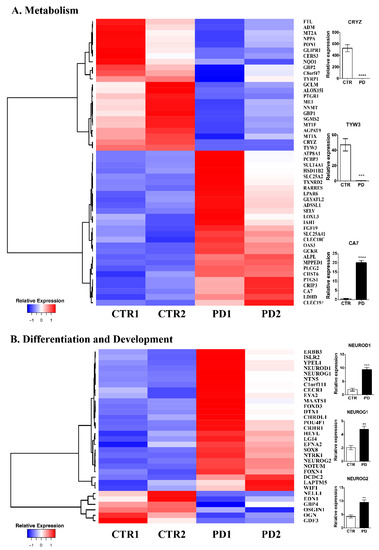 Gene expression analysis of iPSC-derived NPCs. (A,B) Differential gene expression between control (two clones from one healthy subject, CTR1 and CTR2) and PD (two clones from one patient, PD1 and PD2) iPSC-derived NPCs at 13 DIV. Heat maps of genes encoding metabolism (A) and cell differentiation and development genes (B). RT-qPCR analysis of selected genes (A,B) in control and PD NPCs. Gene expression normalized to GAPDH. Data represent mean ± SEM (one-way ANOVA, ** p < 0.01, *** p < 0.001, **** p < 0.0001, n = 3).