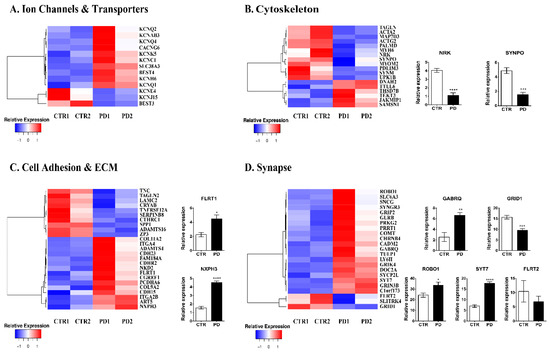 Gene expression analysis of iPSC-derived NPCs. (A–D) Differential gene expression between control (two clones from one healthy subject, CTR1 and CTR2) and PD (two clones from one patient, PD1 and PD2) iPSC-derived NPCs at 13 DIV. Heat maps of genes encoding ion channels and transporters (A), cytoskeleton (B), cell adhesion and ECM (C), synapse-associated genes (D). RT-qPCR analysis of selected genes 9 (B–D) in control and PD NPCs. Gene expression normalized to GAPDH. Data represent mean ± SEM (one-way ANOVA, * p < 0.05, ** p < 0.01, *** p < 0.001, **** p < 0.0001, n = 3).