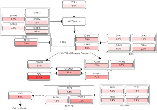 The genetic pathways and frequencies of mutations collected from 13 studies and 4535 samples in the cBioportal platform that results in deregulation in Wnt signaling pathway, leading to the cell phenotypic modification. The dotted arrow illustrates induction. CTNNB1: Catenin Beta 1, TCF7: Transcription Factor 7, DKK: Dickkopf WNT Signaling Pathway Inhibitor, LRP: LDL Receptor Related Protein, SFRP: Secreted Frizzled Related Protein. The percentage under each gene represents the percent of mutated/altered samples related to the profiled ones in those studies [30,31,32,33,34,35,36,37,38].