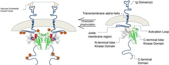 A majority of central cellular activities are carried out by a total of 518 protein kinases present in the human genome which account for about 2% of all human genes [80]. The protein data bank (PDB) has collected 185 unique structures of human protein kinase domain as well as 197 kinases of other species [81]. VEGF protein kinases are greatly involved in many vascular physiologies, such as the development of blood vessels, formation of lymphatic vessels, and homeostasis. Among the VEGF family, VEGF-A, which is also known as vascular permeability factor, is significant for angiogenesis synchronization and vasculogenesis during embryonic development. In addition, VEGF-A plays a substantial role in repairing the function of damaged tissues [82]. However, it could aggravate cancer in the event of an “angiogenic switch”, which occurs due to the imbalance in anti- and pro-angiogenic activities induced by the recruitment of inflammatory cells into the tumor cells [83]. VEGF-A mediates its biological response through VEGFR2, therefore, it is believed that the protein tyrosine kinase VEGFR2 is a potential target for anti-cancer therapy, as it acts as a medium for VEGF-A to exert its biological activities [84]. A large number of α helical C-terminal lobes, together with smaller portions of β strands-filled N-terminal lobe, construct the catalytic protein kinase domains. In the cleft between the two lobes, an active site which is surrounded by a flexible activation loop on its circumference exists. The activation loop is made of a polypeptide which usually consists of serine, threonine, or tyrosine residues that are ready to be phosphorylated. As phosphorylation occurs, the catalytic activity in the protein kinases will increase dramatically (Figure 4) [85].