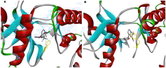 (A) The crystal structure of the VEGFR2 kinase domain in complex with a benzimidazole inhibitor (2QU5) has the phenylalanine (highlighted in yellow) of the DFG motif facing much closer to the surface of the active site; therefore, it is in the inactive DFG-out state, and (B) The crystal structure of the VEGFR2 kinase domain in complex with a naphthamide inhibitor (3B8R), showing that the DFG motif has the phenylalanine (highlighted in yellow) facing in towards the center of the pocket between the N-lobe and C-lobe; therefore, it is in the active DFG-in state. The two PDB-derived structures were visualized by Discovery Studio v21.1.