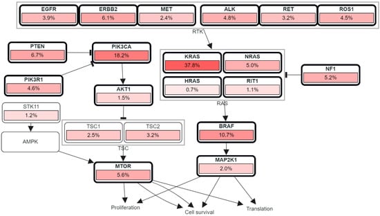 RTK, RAS, and PI3K signaling in colorectal cancer showing the genetic pathways and frequencies of mutations in 13 studies and 4535 samples in cBioportal platform that led to deregulation in this pathway reaching the cell phenotypic modification. The percentage under each gene represents the percent of mutated/altered samples relative to profiled ones in those studies [30,31,32,33,34,35,36,37,38].