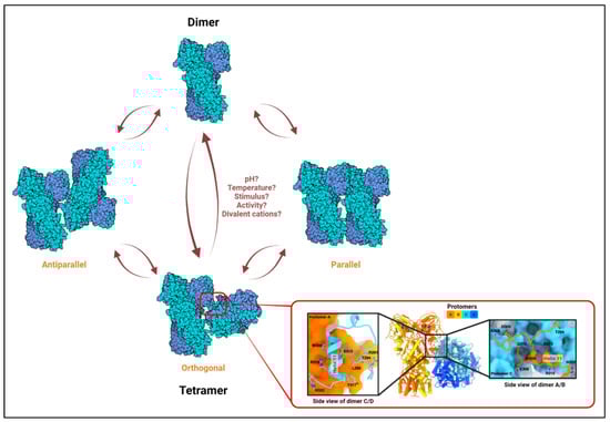 The TRAP1 tetramer. Based on in vitro studies on HSP90 oligomerization, rapid alterations in temperature, chaperone activity, or local concentration of divalent cations, which are common occurrences in the mitochondria, may influence dimer–tetramer transition. Three distinct conformations have been observed for the TRAP1 tetramer in vitro: orthogonal, parallel, and antiparallel [,]. The conditions required for the adoption of or transition to a particular configuration are only predicted and remain unclear. A high-resolution MD-MD dimer–dimer interface has only been shown for the orthogonal structure (shown in the inset; adapted from Liu et. al., Biorxiv., 2020 []). Left and right sub-insets show interacting residues from protomer C (blue) to A (orange) and from A to C at the dimer–dimer interface, respectively.