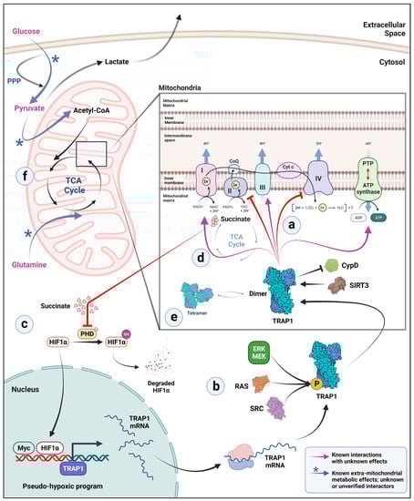 Potential mechanisms of TRAP1 participation in metabolic rewiring. (a) TRAP1 binds to and inhibits electron transport chain (ETC) complexes II and IV in the mitochondria. TRAP1 interacts with protein deacetylase SIRT3 in mitochondria and is reported to inhibit cyclophilin D (CypD), thereby preventing permeability transition pore (PTP) opening and inhibiting apoptosis due to cytochrome c release. (b) Further, TRAP1 activity is enhanced by phosphorylation via several pathways. Note that it remains unclear whether this happens before or after mitochondrial import of TRAP1. (c) ETC complex II inhibition by TRAP1 leads to succinate accumulation, which in turn inhibits prolyl hydroxylases in the cytosol to stabilize HIF1α. Stabilized HIF1α and Myc together activate a pseudo-hypoxic program, which further upregulates TRAP1 gene expression. (d) Inside mitochondria, TRAP1 also binds to ETC complexes I, III, and V (ATP synthase), but with unknown effects. (e) While TRAP1 tetramers exist alongside TRAP1 dimers in the mitochondrial matrix, determinants of the ratio of dimer to tetramer and any functional significance remain enigmatic. (f) TRAP1 presence and absence affect mitochondrial carbon preference. TRAP1 KO cells downregulate glucose- and pyruvate-derived carbon entry into the TCA cycle. A significant proportion of glucose is diverted to the pentose phosphate pathway (PPP) where it is used for the synthesis of NADPH reducing equivalents, perhaps to counter increased reactive oxygen species (ROS) that are characteristic of TRAP1 KO cells, and for the synthesis of ribose sugars. Pyruvate, upon decarboxylation, normally enters the TCA cycle and contributes to formation of acetyl-CoA, an important TCA cycle intermediate. In glycolysis, pyruvate is preferentially metabolized to lactate, generating NAD+ as a by-product of the reaction, at the expense of NADH. As with NADPH, increased levels of NADH provide more reducing equivalents to counter the increased ROS characteristic of TRAP1 KO. In contrast, TRAP1 KO cells utilize anaplerotic glutamine metabolism to maintain a functional TCA cycle by providing glutamine-derived carbon.