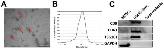 Identification of BMSC-Exos. (A) Cup-shaped morphology of purified BMSC-Exos (indicated with arrows) observed by TEM. Scale bar = 500 nm. (B) Particle size distribution and concentration of BMSC-Exos analyzed by NTA. (C) Western blots of exosomal membrane markers CD9, CD63, and TSG101. BMSC-Exos, bone marrow mesenchymal stem cell-derived exosome; TEM, transmission electron microscope; NTA, nanoparticle tracking analysis.