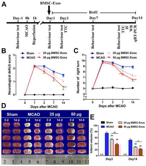 To evaluate therapeutic effects of BMSC-Exos, mice were divided into four cohorts: sham operation group, MCAO group, MCAO plus 25 μg BMSC-Exos group (25 μg BMSC-Exos group), and MCAO plus 50 μg BMSC-Exos group (50 μg BMSC-Exos group), and then Exos were administered in 100 μL PBS or PBS alone via tail vein injection at 24 h after ischemia. To observe cell proliferation, 5-bromo-2-deoxyuridine (BrdU, Sigma-Aldrich, St. Louis, MO, USA) of 50 mg/kg was administered in mice via intraperitoneal injection 24 h after ischemia, followed by daily consecutive injection for 14 days.