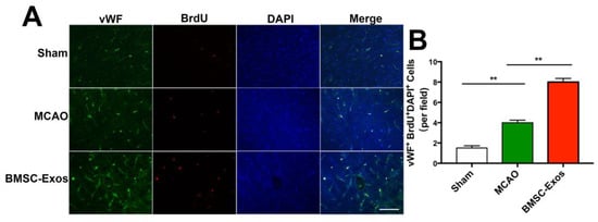 Proliferative microvessel density was estimated by BrdU/vWF immunofluorescent staining on day 14 after MCAO. The number of BrdU+/vWF+ cells was significantly increased in the MCAO and BMSC-Exos groups compared with the sham group. Furthermore, microvessel density in the BMSC-Exos group was significantly higher than that in the MCAO group (Figure 4A,B).