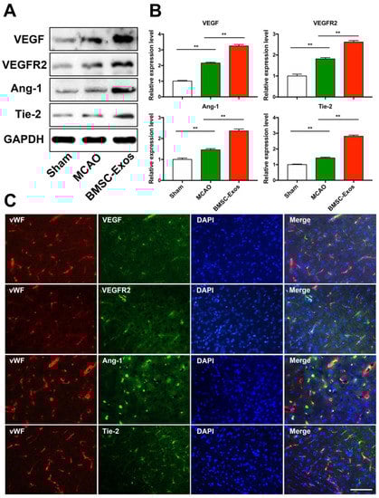 BMSC-Exos increased VEGF/VEGFR2 and Ang-1/Tie-2 protein expression after MCAO in mice. (A,B) Representative western blot analysis and quantification of densitometries of Western blot band. n = 3/group. ** p < 0.01. (C) Representative immunofluorescence images of the infarct boundary zone stained for vWF (red), VEGF/VEGFR2/Ang-1/Tie-2 (green), and DAPI (blue). Scale bar = 200 μm. vWF, von Willebrand factor; BrdU, 5-bromo-2-deoxyuridine; DAPI, 4′,6-diamidino-2-phenylindole; BMSC-Exos, bone marrow mesenchymal stem cell-derived exosomes; MCAO, middle cerebral artery occlusion; VEGF, vascular endothelial growth factor; VEGFR2, vascular endothelial growth factor receptor 2; Ang-1, angiogenin-1; Tie-2, tyrosine kinase receptor-2; GAPDH, glyceraldehyde-3-phosphate dehydrogenase.