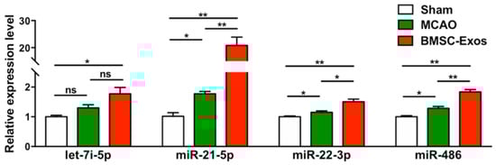 The expression levels of miRs in ischemic brains were determined by qRT-PCR. n = 3/group. * p < 0.05. ** p < 0.01, ns, no significance; BMSC-Exos, bone marrow mesenchymal stem cell-derived exosomes; MCAO, middle cerebral artery occlusion.