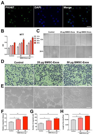 BMSC-Exos promoted proliferation, migration and tube formation of HUVECs. (A) PKH-labeled BMSC-Exos were uptake by HUVECs. Scale bar = 50 μm. (B) Cell viability was determined by MTT assay. n = 6/group. * p < 0.05. ** p < 0.01. (C) Representative images of scratch assay in HUVECs. Scale bar = 200 μm. (D) Representative images of migrated HUVECs in Transwell assay. Scale bar = 100 μm. (E) Representative images of tube formation of HUVECs. Scale bar = 200 μm. (F) Relative measurement of migration distance. n = 3/group. * p < 0.05. ** p < 0.01. (G) Number of migration cells in Transwell assay. n = 3/group. * p < 0.05. ** p < 0.01. (H) Total length of tube formed by HUVECs. n = 3/group. ** p < 0.01. DAPI, 4′,6-diamidino-2-phenylindole; MTT, 3-(4,5-dimethyl-2-thiazolyl)-2,5-diphenyl-2-H-tetrazolium bromide; OD, optical density; BMSC-Exos, bone marrow mesenchymal stem cell-derived exosomes.