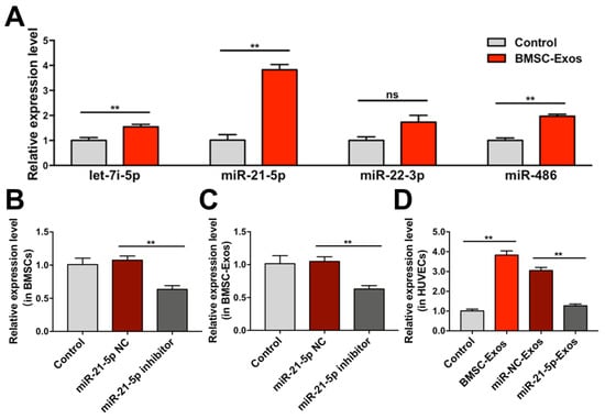 The expression of miRs in vitro were determined by qRT-PCR. (A) The expression levels of let-7i-5p, miR-21-5p, miR-22-3p and miR-486 in HUVECs treated with BMSC-Exos. ** p < 0.01. ns, not significant. (B) The expression levels of miR-21-5p in BMSCs after miR-21-5p inhibitor transfection. ** p < 0.01. (C) The expression levels of miR-21-5p in Exos derived from miR-21-5p inhibitor transfected BMSCs. ** p < 0.01. (D) The expression levels of miR-21-5p in HUVECs treated with Exos derived from miR-21-5p inhibitor transfected BMSCs. ** p < 0.01. n = 3/group. BMSCs, bone marrow mesenchymal stem cells; BMSC-Exos, bone marrow mesenchymal stem cell-derived exosome; miR-21-5p NC, miR-21-5p inhibitor negative control; miR-NC-Exos, Exos derived from BMSCs transfected with miR-21-5p inhibitor negative control; miR-21-5p-Exos, Exos derived from BMSCs transfected with miR-21-5p inhibitor.
