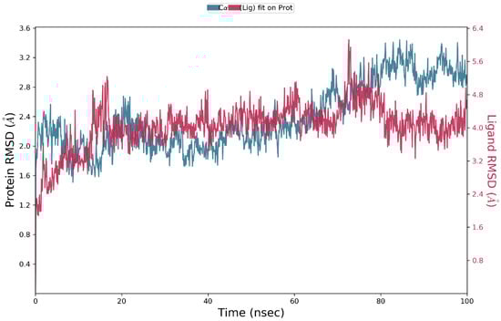 Molecular Dynamics (MD) simulation studies help envisage the protein–ligand complex’s actions at the target’s binding site region in the physiological conditions. MD was performed using the Desmond module of Schrodinger developed by the D.E. Shaw research group (academic license) through the system’s builder panel; the orthorhombic simulation box was prepared with the Simple Point–Charge (SPC) explicit water model in such a way that the minimum distance between the protein surface and the solvent surface was 10 Å. Three runs of MD simulations were performed in order to confirm the consistency of the results. Protein–ligand docked complexes were solvated using the orthorhombic SPC water model [32]. The solvated system was neutralized with counter ions, and the physiological salt concentration was limited to 0.15 M. The receptor–ligand complex system was designated with the OPLS AA force field [33].