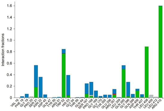 Various interactions of the ligand with the amino acids are represented. Amino acids of PvdA that have interactions with the ligand and the type of interaction are provided. Green—Hydrogen Bond; Red—Ionic; Lavender—Hydrophobic; Blue—Water Bridge. Arg357 was found to have three kinds of interactions, namely, a hydrogen bond, water-bridge, and ionic interaction. The interaction fraction is the number of interactions had by a residue normalized by the simulation time during which the interaction existed. An interaction fraction that is more than 1 is possible when the particular residue has more than one interaction.