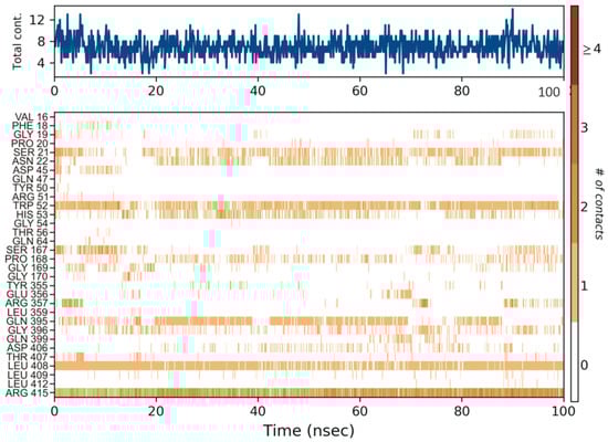 The number of contacts made by the ligand throughout the 100 ns simulation is shown in the top panel (appears in blue). Some residues make more than one specific contact with the ligand, which is represented by a darker shade of orange in the bottom panel, according to the scale to the right of the plot. Arg357 was found to make more than one single contact with the ligand.