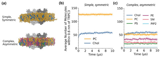 In order to investigate the interaction of TRPC3 with its lipid environment, we simulated the protein in two types of coarse-grained membranes. System 1 is a two-component, symmetric membrane composed of 70% phosphatidylcholine (PC) and 30% cholesterol (Chol) (Figure 1a). System 2 is a six-component, asymmetric membrane composed of PC, Chol, phosphatidylethanolamine (PE), phosphatidylserine (PS), sphingomyelin (SM) and phosphatidylinositol bisphosphate (PIP2) and is designed to represent a simplified plasma membrane (Table 1) [48]. Four independent repeats in which the lipids were randomly placed in their starting configurations were run for each system, giving a total of 80 µs of simulation time. Prior to simulation, the lipids were randomly placed in a grid-like fashion around the protein, and during the course of the 10 µs-long simulations, the lipids could freely diffuse and interact with TRPC3. To begin, we calculated the average number of lipid molecules within 0.6 nm of the TRPC3 homotetramer as a function of time to quantify the lipid content in the first layer of lipids surrounding TRPC3 (Figure 1b,c). This allows us to determine when the protein and lipids have reached an equilibrium, and from this, it is clear that the phospholipids and cholesterol equilibrate rapidly in coarse-grained simulations with TRPC3, within a timescale of 1 µs. All further calculations are based on the equilibrated portion of the simulation (1 to 10 µs).