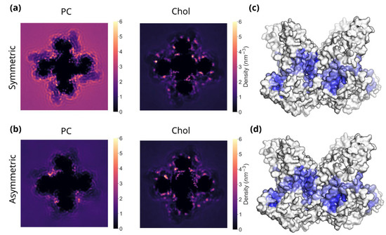 (a) Two-dimensional density maps showing PC and cholesterol densities for the two-component, symmetric membrane. For each system, the maps are averaged over four repeats and a Gaussian filter with a sigma value of 3 has been applied. (b) As in (a), for the six-component, asymmetric membrane. (c) Cholesterol enrichment map for the symmetric membrane, indicating in blue the residues where cholesterol binding is enriched (i.e., cholesterol accounts for over 30% of the contacts). Residues in grey indicate residues where cholesterol binding is not enriched. (d) As in (c), for the six-component, asymmetric membrane.