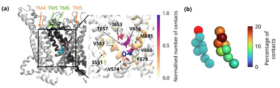 Conversely, the residues with the greatest maximum occupancy values are largely localised to the domain-swapped interface of the VSLD and pore domains, where displacement analysis shows slow diffusion of cholesterol molecules (Figure 3b,d,h). The residue with the highest maximum occupancy value, Val-660, is found on the S6 helix in a position that faces not only the bilayer but also the S5 helix of the adjacent subunit. Other residues identified through the maximum occupancy criteria include residues of the S4 (e.g., Ile-553) and S5 helices (e.g., Phe-591). These residues are found in a more buried location than those identified through contact duration. The hydrophobicity of cholesterol, which allows it to flip between leaflets of the bilayer without the requirement of a lipid transporter, likely facilitates its binding to these residues. Once bound, there is little exchange of cholesterol molecules, with Val-660 as a prime example that typically interacts with only one or two cholesterol molecules (Figure 3f), although not all Val-660 residues engage with a cholesterol during the course of the 10 µs simulation. Both the localisation of this residue to a domain interface and the slow exchange of cholesterol molecules are indicative of a non-annular binding site. In order to characterise this potential non-annular binding site better, we determined which residues are also in contact with cholesterol when it is bound to Val-660. As Figure 4a shows, cholesterol bound to Val-660 makes contacts with multiple residues at the interface between the VSLD and pore domain. Many of these residues, for example Thr-657 and Val-587, were also identified through the maximum occupancy analysis (Figure 3d). It is notable that this oligomerisation interface, as resolved by cryo-EM, has a large hollow towards the lower end of the transmembrane helices. It is possible that this hollow is occupied by cholesterol molecules that were not resolved in the cryo-EM structure. Interestingly, our data also show that cholesterol bound here still explores significant conformational space once bound, interacting with multiple residues from both domains (Figure 4a). This is in agreement with previous molecular dynamics simulations which have proposed that cholesterol rarely binds in a rigid manner to binding sites, preferring to bind to “greasy hollows” of the protein in which it can still adopt a range of binding poses [51,52].