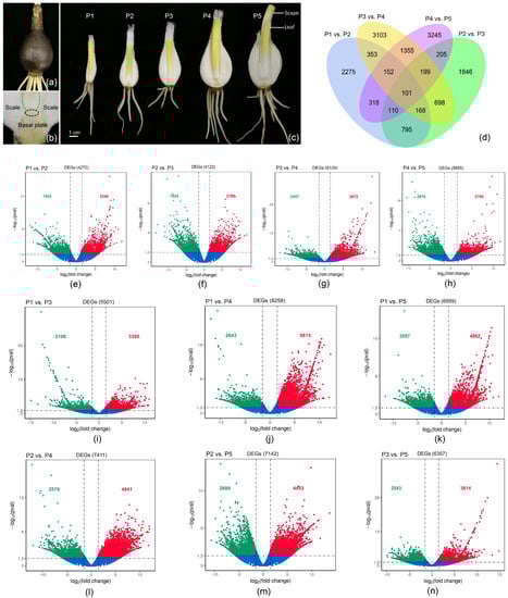 The samples subjected to RNA-Seq and the numbers of differentially expressed genes (DEGs) for the samples: (a) external morphology of the bulb; (b) sectional view of the internal organizational structure of the bulb (the samples were collected from the meristem site); (c) morphological characteristics of the five samples. P1−P3: 1−3-year-old bulbs that cannot flower, P4−P5: 4-year-old nonflowering and flowering bulbs, respectively. (d) Venn diagram of the DEGs in combinations of P1 vs. P2, P2 vs. P3, P3 vs. P4, and P4 vs. P5. (e–n) The volcano plots show the number of DEGs for each combination of different samples.