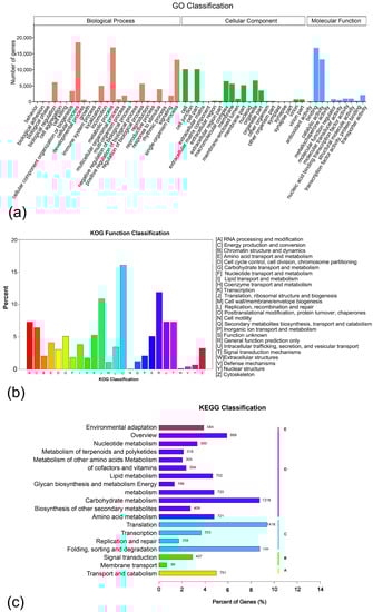 The annotation of identified unigenes in three databases. (a) GO function classification, where the horizontal axis shows the three GO terms: biological processes, cellular components, and molecular functions; the vertical axis shows the number of genes annotated under each term. (b) KOG function classification, where the vertical axis gives the names of the 26 KOG groups, and the horizontal axis gives the percentages of annotated genes. (c) KEGG pathway annotation, where the vertical axis gives the names of the KEGG metabolic pathways, and the horizontal axis gives the numbers and percentages of genes annotated to this pathway.