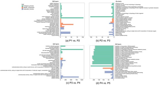 The GO enrichment of DEGs identified the biological functions significantly related to these genes. In the pairwise comparison enrichment analysis, enriched GO terms were shown in bulbs aged more than three years, including comparisons for P3 vs. P4 and P4 vs. P5 (Figure 3c,d). These pairs had significantly more genes than P1 vs. P2 and P2 vs. P3, where the number of DEGs in most GO terms was less than 25, and most genes were enriched in the oxidation–reduction process (Figure 3a,b). During the transition from vegetative growth to reproductive growth, most genes were classified by the GO term molecular function and two processes, metabolic processes (biological process), and catalytic activity (molecular function), which were enriched in more than 700 genes (Figure 3c). In four-year-old bulbs, most genes that determine whether to flower were classified under the GO term biological process, and these terms were totally different from the DEGs identified in the other three comparisons (Figure 3d).