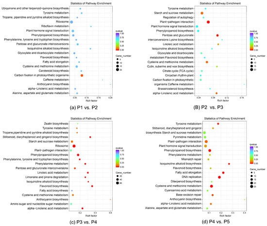 Through significant pathway enrichment, the most important biochemical metabolic pathways and signal transduction pathways involving the differentially expressed genes were determined. For each comparison, a total of 20 pathways were enriched and the assigned DEG numbers were 346 (P1 vs. P2), 301 (P2 vs. P3), 750 (P3 vs. P4), and 543 (P4 vs. P5). There were six pathways that were simultaneously enriched in four comparisons: ‘Tyrosine metabolism’, ‘Phenylpropanoid biosynthesis’, ‘Isoquinoline alkaloid biosynthesis’, ‘Flavonoid biosynthesis’, ‘Cysteine and methionine metabolism’, and ‘alpha-Linolenic acid metabolism’. This suggests the universality of these pathways in bulb development, biosynthesis, and metabolism (Figure 4). In two- to four-year-old bulbs, the DEGs were enriched in two common pathways: ‘starch and sucrose metabolism’ and ‘plant–pathogen interaction’ (Figure 4b–d). Two pathways ‘Stilbenoid, diarylheptanoid, and gingerol biosynthesis’ and ‘Phenylalanine metabolism’ were enriched in the stage from vegetative growth to reproductive growth (P3 vs. P4 and P4 vs. P5) (Figure 4c,d). Several pathways were only enriched in four-year-old nonflowering and flowering bulbs: ‘pyrimidine metabolism’, ‘DNA replication’, ‘diterpenoid biosynthesis’, and base excision repair (Figure 4d).