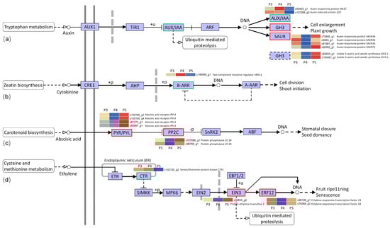 Enriched KEGG pathway terms associated with plant hormone signal transduction in P4 vs. P5. (a–d) The auxin, cytokinin, abscisic acid, and ethylene signal transduction pathways. The borders of KO nodes of upregulated genes are marked in red, and the downregulated genes are marked in green. The expression level of the related unigenes from P3 to P5 are shown in the heatmap beside the nodes, the color from blue to red means that the gene expression level is from low to high.