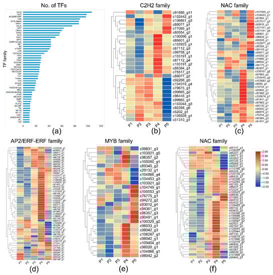 The statistics and abundance of transcription factor families (TFs): (a) forty−eight TF families with more than 10 identified unigenes; (b–f) comparison of P4 and P5 showing the differentially expressed TFs in the C2H2, NAC, AP2/ERF-ERF, MYB-related, and WRKY families.