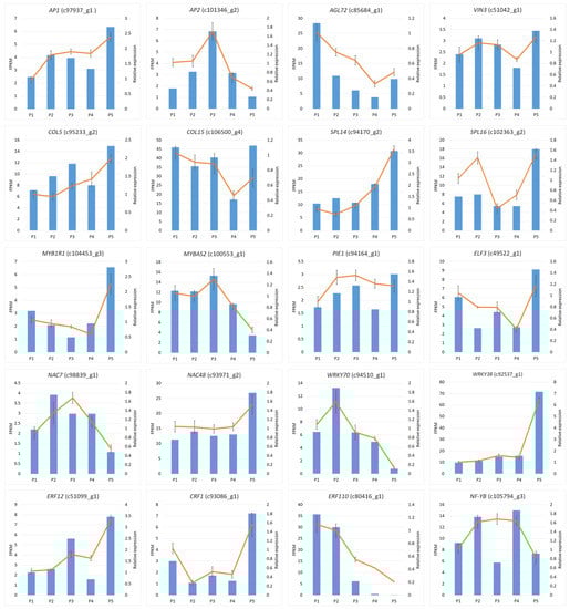 qRT-PCR validation of the expression level of 20 DEGs related to plant flowering. The x-axis shows the five samples, and the y-axis shows the FPKM by RNA-Seq and the relative quantitative expression level by qRT-PCR for each unigene.