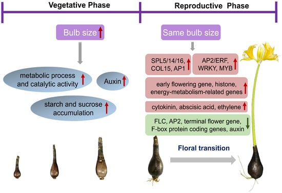 Hypothetical model for the regulatory networks of bulb growth and flowering in Lycoris chinensis. Up and red arrows indicate increased or upregulated expression, down and green arrows indicate downregulated gene expression.