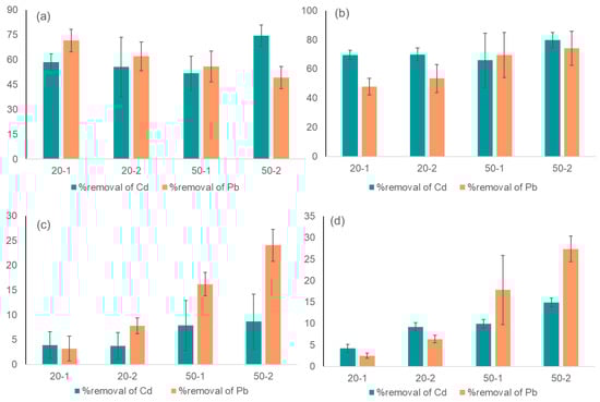 Heavy metal removal (%) after ACP treatment and absorption from the following: (a) water for 20 and 50 kV, at 1 and 2 min, with 0 retention time; (b) water for 20 and 50 kV, at 1 and 2 min, with 24 h retention time; (c) milk for 20 and 50 kV, at 1 and 2 min, with 0 retention time; (d) milk for 20 and 50 kV, at 1 and 2 min, with 24 h retention time.