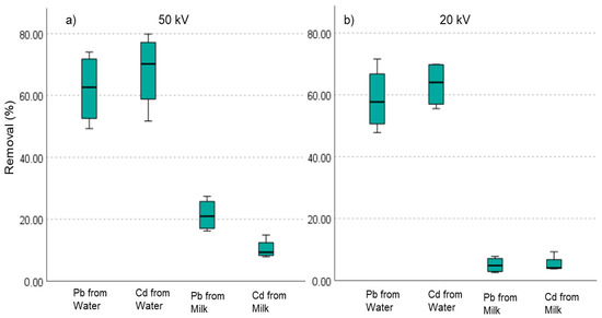 Non-parametric Kruskal–Wallis test was conducted to compare the mean removals of heavy metals from milk and water (Figure 5). The distribution of metal removal across the 50 kV voltage is significantly different (p < 0.05). This is also similar to the 20 kV treated samples. Mean Cd removal was higher in milk and water, while mean Pb removal was lower. At a low voltage of 20 kV, the metal’s removal was negligible.