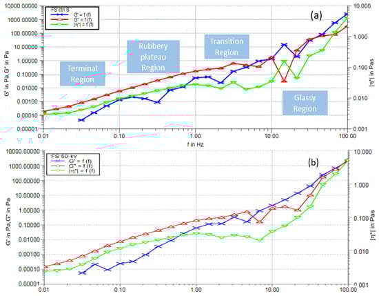 A frequency sweep (FS) test was conducted for 50 kV ACP-treated and absorbent-induced milk samples and the control milk sample to see the differences in rheological parameters of milk (Figure 6). Since the optimal voltage for efficient heavy metal removal was found at 50 kV, the FS test was conducted for the 50 kV only. The viscoelastic behavior of milk as a function of time can be measured using this FS test. Additionally, most of the liquid food processing requires the evaluation of quality control, structural change, and operational feasibility in the finished products. Hence, the FS test can provide the viscous behavior of treated milk, which in turn provides the quality of it for further processing. There has not been much dissimilarity observed between the control and treated samples in the frequency range from 0.01 to 100 Hz. In the frequency range, divided into four regions as terminal, rubbery plateau, transition, and glassy region, there was slight deformation noticed in the rubbery plateau region and glassy region for the storage modulus (G′). This probably impacted the absorbent induction to the milk sample. Added to this, loss modulus (G″) was also slightly lower at the end of the transition region for the treated sample. It is to be noted that the G′ and G″ measure the elastic and the viscous components of the sample, respectively. The viscous modulus was dominant over the elastic modulus until 5 Hz, and hence, the shifting properties are dependent on frequency for both samples. However, it was also observed that the complex viscosity (η*) pattern was similar at different frequencies for both the control and the treated samples, except for a smooth shift from 10 Hz to 20 Hz for the treated samples. Therefore, it can be elucidated that the treated samples showed minimal quality change in the milk in structure and viscosity.