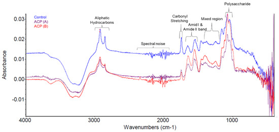 FTIR spectrum of the milk samples. ACP (A) and ACP (B) denotes the sample treated with 50 kV for 2 min with 0- and 24 h storage time, respectively.