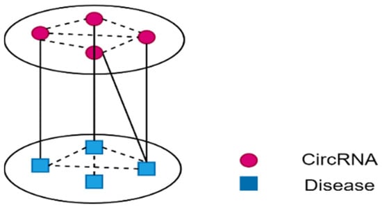Based on the above data processing, we constructed a heterogeneous network (called ) consisting of circRNA-disease association network, circRNA feature vector and disease feature vector. The edges between circRNAs (or diseases) represent their similarity, and the edges between circRNAs and diseases represent associations. Meanwhile, we introduced a penalty factor to control the contribution of similarity to the model. The construction expression of the heterogeneous network can be shown as Equation (11), and its representation is shown in Figure 1.