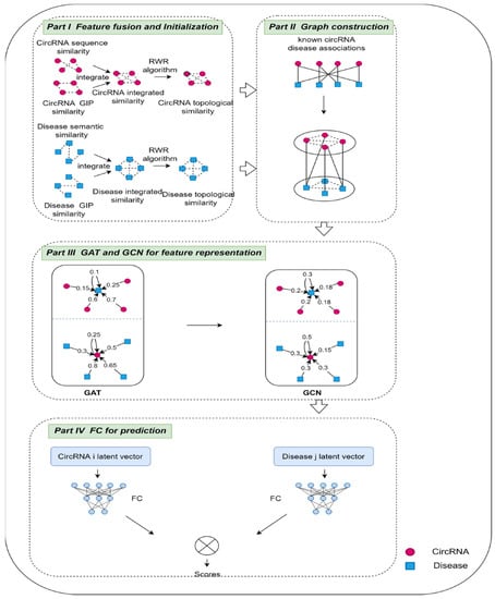 where and represent circRNA sequence similarity and GIP similarity, respectively, and and represent disease semantic similarity and GIP similarity, respectively.