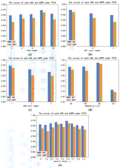 Specifically, the attention model using multiple heads in the GAT layer will be more robust. As shown in Figure 4a, we set the number of heads as (2, 4, 8, 16, 32). It can be seen that GGCDA can achieve better performance with the increase in the number of attention heads, but the performance will decline when the number exceeds 16. So, we set the number of heads of GAT to 16. In addition, the number of layers of GAT and GCN will also have an impact on the model. We set the number of layers for these two components, and the experimental results as shown in Figure 4b,c. It can be seen that GAT and GCN both perform best when the number of layers is 1. When the number of layers increases, GGCDA cannot learn much information. Finally, we explore the impact of embedding on the model effect. Different from previous studies, we set the embedding number as (64, 128, 256, 512). As shown in Figure 4d, when the embedding number is 256, GGCDA can achieve the best performance. We also set the penalty factors from 0.1 to 0.9, and the results from Figure 4e show that when is equal to 0.6, it contributes the most to the performance of the model.