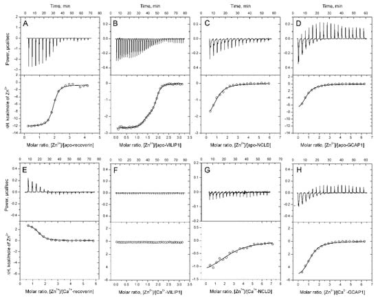 Figure 1. Binding of zinc ions to NCS proteins. Association between zinc ions and NCS proteins was monitored with ITC: (A) apo-recoverin; (B) apo-VILIP1; (C) apo-NCLD; (D) apo-GCAP1; (E) Ca2+-recoverin; (F) Ca2+-VILIP1; (G) Ca2+-NCLD; (H) Ca2+-GCAP1. Upper panels contain representative titration curves, and lower panels contain binding isotherms (open circles) and, where available, best fits (solid curves).