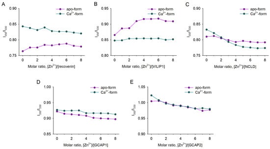 Figure 2. Zn2+-induced conformational changes of NCS proteins. Conformational shifts were detected by monitoring innate tryptophan fluorescence intensity at 350/330 nm (I350/I330) using the nanoDSF approach: (A) recoverin; (B) VILIP1; (C) NCLD; (D) GCAP1; (E) GCAP2. Fluorescence intensity ratios at 37 °C for apo- and Ca2+-bound NCS proteins were registered in the presence of increasing Zn2+ concentrations.