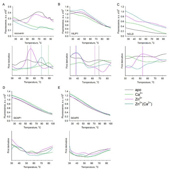 Figure 3. Thermal stability of NCS proteins in the presence of zinc. Thermal unfolding of metal-bound NCSs was monitored using the TS assay: (A) recoverin; (B) VILIP1; (C) NCLD; (D) GCAP1; (E) GCAP2. NCS samples were loaded with Sypro Orange hydrophobic fluorescent dye in the presence of Ca2+, Zn2+, both (“Zn2+(Ca2+)”), or neither (“apo”), and fluorescence intensity was monitored at 25–99 °C (top panels). Mid-transition melting temperatures (Tm) were calculated based on the first derivative of each melting curve (bottom panels). Dashed lines represent heat denaturation points.