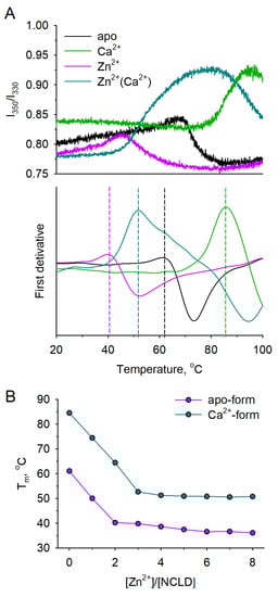 Figure 4. Thermal stability of NCLD in the presence of zinc. Thermal unfolding of NCLD was monitored using the nanoDSF approach by measuring temperature dependance of innate tryptophan fluorescence intensity ratio (I350/I330). (A) Top panel: melting curves of NCLD in the presence of saturating concentrations of Ca2+, Zn2+, both (“Zn2+(Ca2+)”), or none (“apo”); bottom panel: first derivative of the melting curve. (B) Tm of apo- and Ca2+-saturated NCLD in the presence of increasing Zn2+ concentrations. Dashed lines represent heat denaturation points.