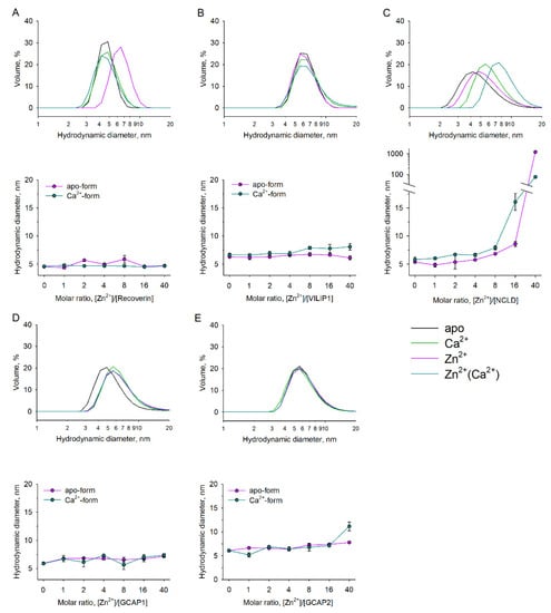 Figure 5. Zn2+-dependent oligomerization/aggregation of NCS proteins. Hydrodynamic diameter of NCS proteins was assessed by DLS: (A) recoverin; (B) VILIP1; (C) NCLD; (D) GCAP1; (E) GCAP2. All measurements were performed at 25 °C. Upper panels: representative size distribution curves for NCS in the presence of saturating concentrations of Ca2+, Zn2+, both (“Zn2+(Ca2+)”), or neither (“apo”). Bottom panels: mean hydrodynamic diameter values for apo- and Ca2+-bound NCS proteins in the presence of increasing Zn2+ concentrations. Standard error bars were plotted as a result of three independent measurements.